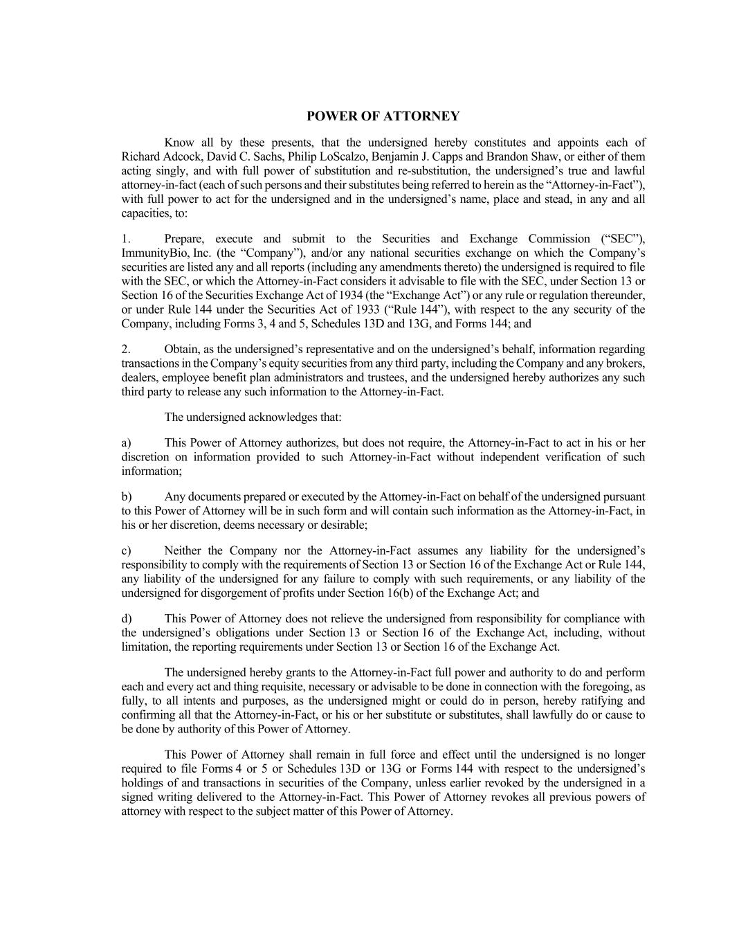 POWER OF ATTORNEY Know all by these presents, that the undersigned hereby constitutes and appoints each of Richard Adcock, David C. Sachs, Philip LoScalzo, Benjamin J. Capps and Brandon Shaw, or either of them acting singly, and with full power of substitution and re-substitution, the undersigned’s true and lawful attorney-in-fact (each of such persons and their substitutes being referred to herein as the “Attorney-in-Fact”), with full power to act for the undersigned and in the undersigned’s name, place and stead, in any and all capacities, to: 1. Prepare, execute and submit to the Securities and Exchange Commission (“SEC”), ImmunityBio, Inc. (the “Company”), and/or any national securities exchange on which the Company’s securities are listed any and all reports (including any amendments thereto) the undersigned is required to file with the SEC, or which the Attorney-in-Fact considers it advisable to file with the SEC, under Section 13 or Section 16 of the Securities Exchange Act of 1934 (the “Exchange Act”) or any rule or regulation thereunder, or under Rule 144 under the Securities Act of 1933 (“Rule 144”), with respect to the any security of the Company, including Forms 3, 4 and 5, Schedules 13D and 13G, and Forms 144; and 2. Obtain, as the undersigned’s representative and on the undersigned’s behalf, information regarding transactions in the Company’s equity securities from any third party, including the Company and any brokers, dealers, employee benefit plan administrators and trustees, and the undersigned hereby authorizes any such third party to release any such information to the Attorney-in-Fact. The undersigned acknowledges that: a) This Power of Attorney authorizes, but does not require, the Attorney-in-Fact to act in his or her discretion on information provided to such Attorney-in-Fact without independent verification of such information; b) Any documents prepared or executed by the Attorney-in-Fact on behalf of the undersigned pursuant to this Power of Attorney will be in such form and will contain such information as the Attorney-in-Fact, in his or her discretion, deems necessary or desirable; c) Neither the Company nor the Attorney-in-Fact assumes any liability for the undersigned’s responsibility to comply with the requirements of Section 13 or Section 16 of the Exchange Act or Rule 144, any liability of the undersigned for any failure to comply with such requirements, or any liability of the undersigned for disgorgement of profits under Section 16(b) of the Exchange Act; and d) This Power of Attorney does not relieve the undersigned from responsibility for compliance with the undersigned’s obligations under Section 13 or Section 16 of the Exchange Act, including, without limitation, the reporting requirements under Section 13 or Section 16 of the Exchange Act. The undersigned hereby grants to the Attorney-in-Fact full power and authority to do and perform each and every act and thing requisite, necessary or advisable to be done in connection with the foregoing, as fully, to all intents and purposes, as the undersigned might or could do in person, hereby ratifying and confirming all that the Attorney-in-Fact, or his or her substitute or substitutes, shall lawfully do or cause to be done by authority of this Power of Attorney. This Power of Attorney shall remain in full force and effect until the undersigned is no longer required to file Forms 4 or 5 or Schedules 13D or 13G or Forms 144 with respect to the undersigned’s holdings of and transactions in securities of the Company, unless earlier revoked by the undersigned in a signed writing delivered to the Attorney-in-Fact. This Power of Attorney revokes all previous powers of attorney with respect to the subject matter of this Power of Attorney.